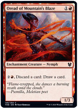 Oread of Mountain's Blaze will probably end up getting outclassed in constructed for stronger cards, but I don't think this card was made to be played in constructed. This doesn't have bad stats for a 2-drop, it is able to block (and survive) just about any 1 or 2 drop in the set, which makes it a pretty good card for limited. Plus, in a set where consistency and card advantage can be hard to find, any sort of drawing/cycling ability is appreciated.