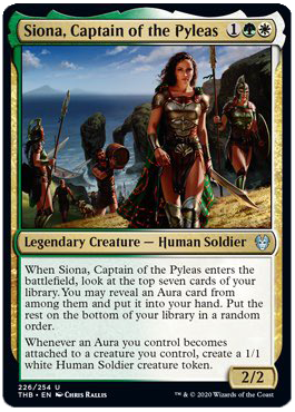 Siona, Captain of the Pyleas looks like a very useful tool for "aura" decks. She doesn't have the worst stats in the world, but the is able to semi-tutor you an aura, and she will pump out extra tokens for you to put the auras on. This card will help the consistency of the deck a lot because it both creates targets for your auras to hit and it also gets you an aura in your hand.