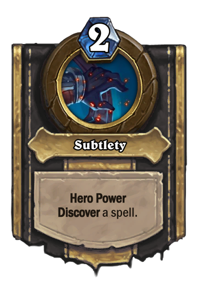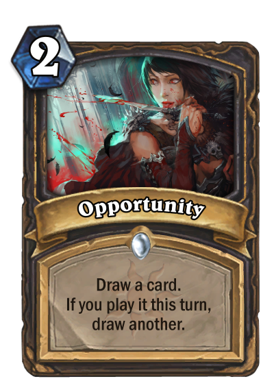 A final card of interest is Rogue's Opportunity. I based this off of the removed beta card Adrenaline Rush, which drew 1 card, but could Combo to draw two instead. The design went through many iterations, mostly focusing on how to encourage additional draw without being too synergetic with Miracle Rogues. Finally, I settled on synergizing with the next card drawn. The flavorful intentions is the first card represents the opportunity given to the rogue, and the second is the reward for capitalizing upon the first."