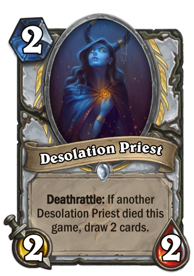 Another of my favorites is Desolation Priest. Like Muse Arietta, low-cost minions often dramatically fall in value as the game progresses. However, by offering a Deathrattle that is generally only available when the game has progressed to a certain degree. Furthermore, it offers Deathrattle synergy through existing cards like Twilight's Call and Shadowy Figure.