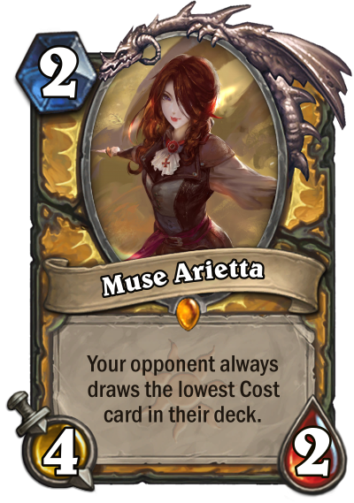 Phoenix: "My favorite card of the set is probably Paladin's Muse Arietta. I tried making a card that would have a skewed stat-line while having an interesting effect that varies value throughout the game. Early in the game, Muse Arietta's text offers your opponents cheap removal or counterplay options by giving them easily playable cards. However, as the game progresses, Arietta creates a hindrance by offering your opponent low value cards.