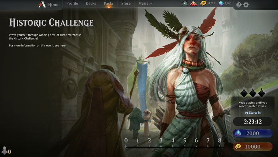 - 7 Wins: 20 Historic booster packs, 10,000 Gold, Treasure Hunt Sleeve and Gaea’s Cradle Sleeve