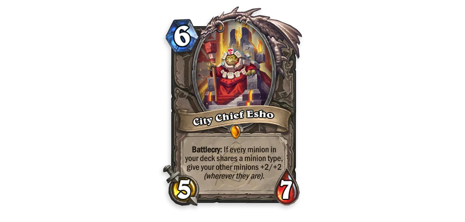 City chief Esho - Is the kind of card that makes you worry about the direction of the next expansion. Tribal synergy decks tend to have the shortest shelf life in hearthstone because theyre not interesting and is highly predictable. Is the card good though? Well, I think theres a possibility that the card is OP but no one would be playing it past diamond.