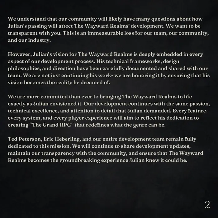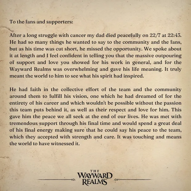 That same day, OnceLost Games put out an update post on their Kickstarter page honoring Julian LeFay. The next day, Julian's daughter Shae posted her own update on their Kickstarter page regarding LeFay's passing.