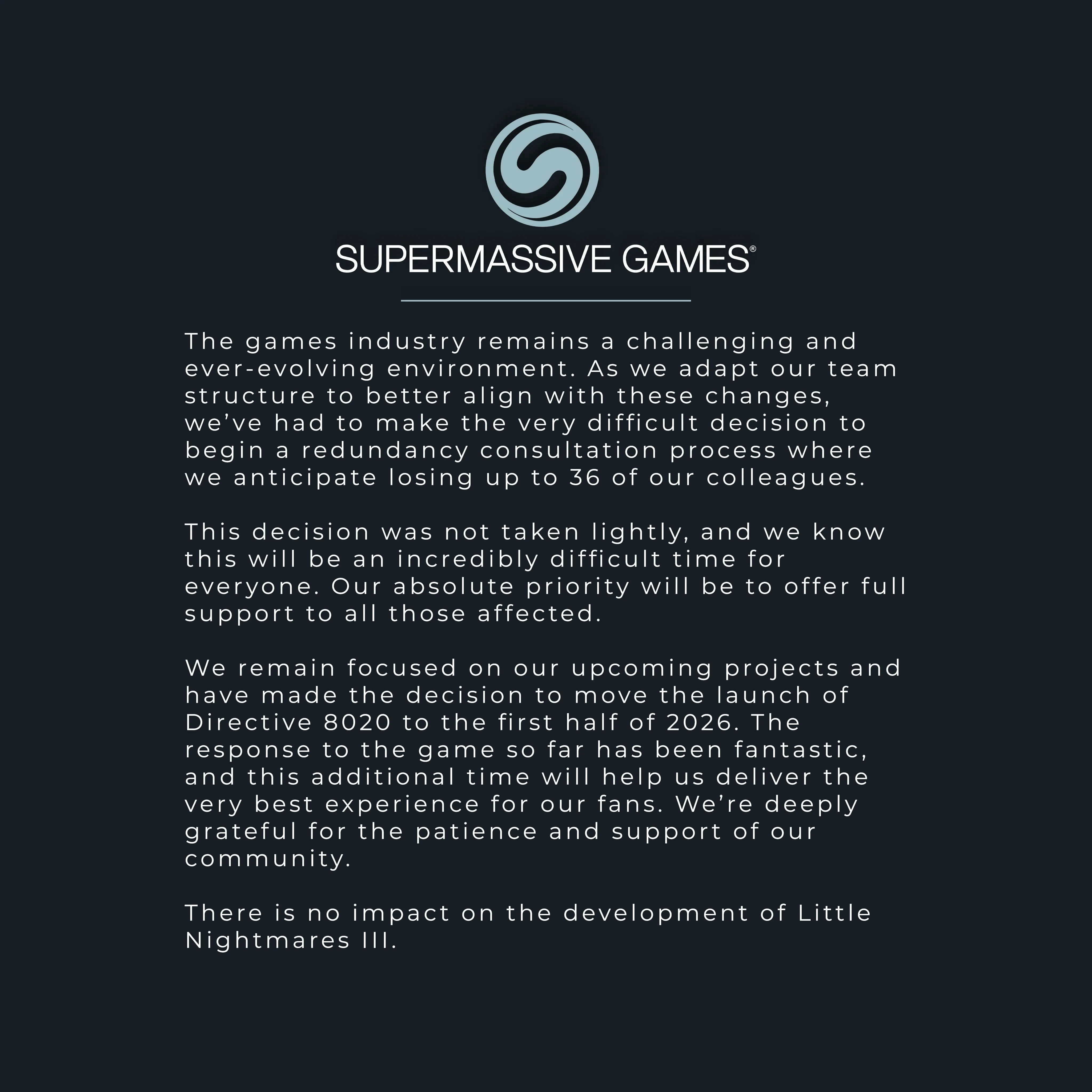Supermassive Games announced that it will delay the release of Directive 8020 into the first half of 2026 along with laying off up to 36 employees, although it did also announce that this would have no effect on the development of Little Nightmares III.