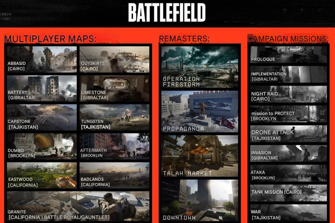 As we can see, we can expect Battlefield's maps to take place in California (USA), Brooklyn (USA), Cairo (Egypt), Gibraltar, and Tajikistan.