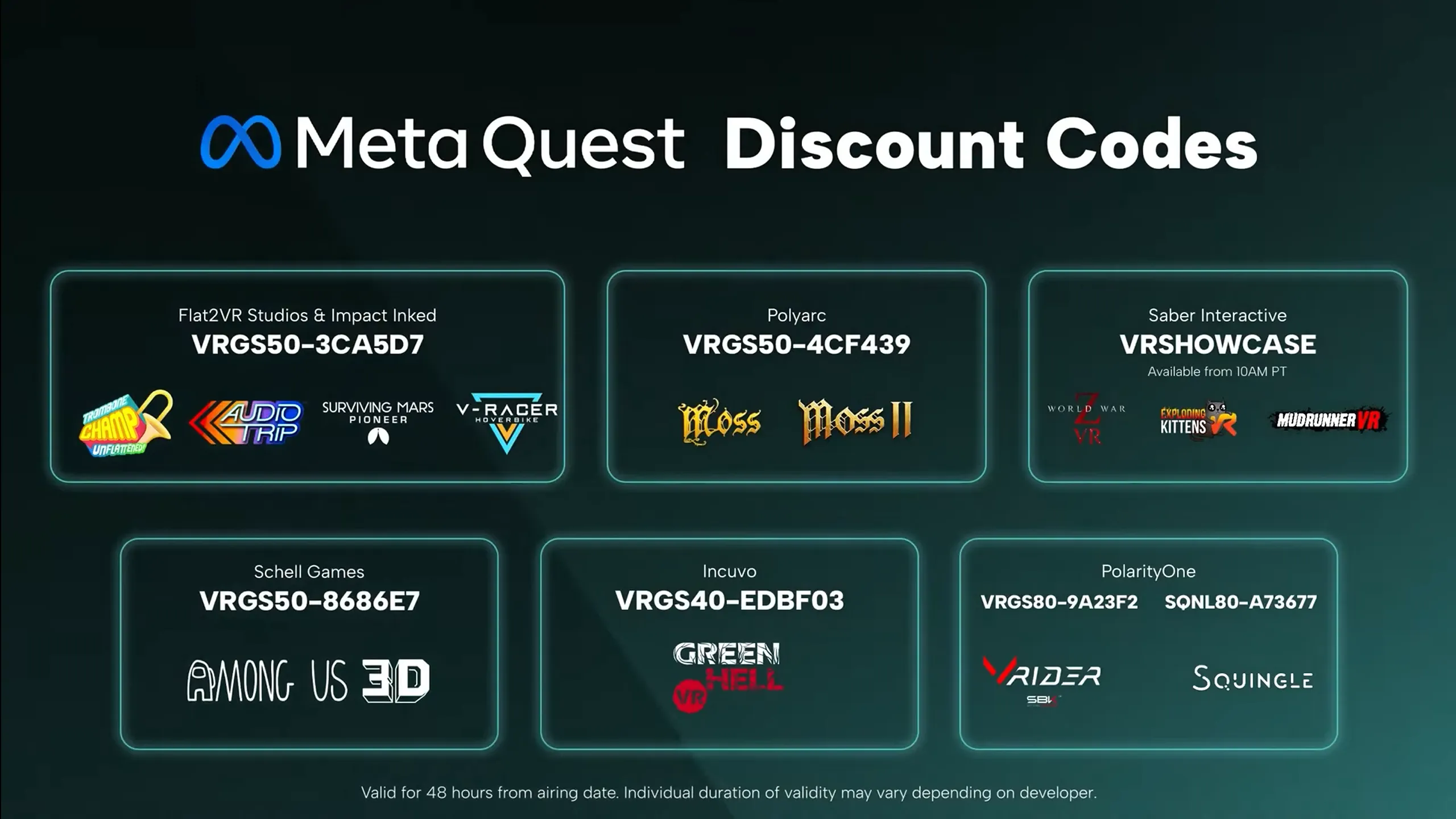 Before we get into the games proper, Meta Quest users can get a number of games discounted using the codes in the screenshot below.