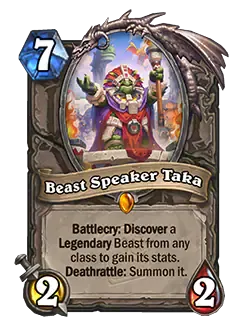 Beast Speaker Taka - Its not flashy. The only good thing about this card is that its a 7 drop, which most decks tend to want. The beast it will summon is pretty much forgettable since you have to forgo the battlecry. Basically, its just a big thing that summons a big thing. Most of the time you'll get destroyed way before any of this becomes relevant.