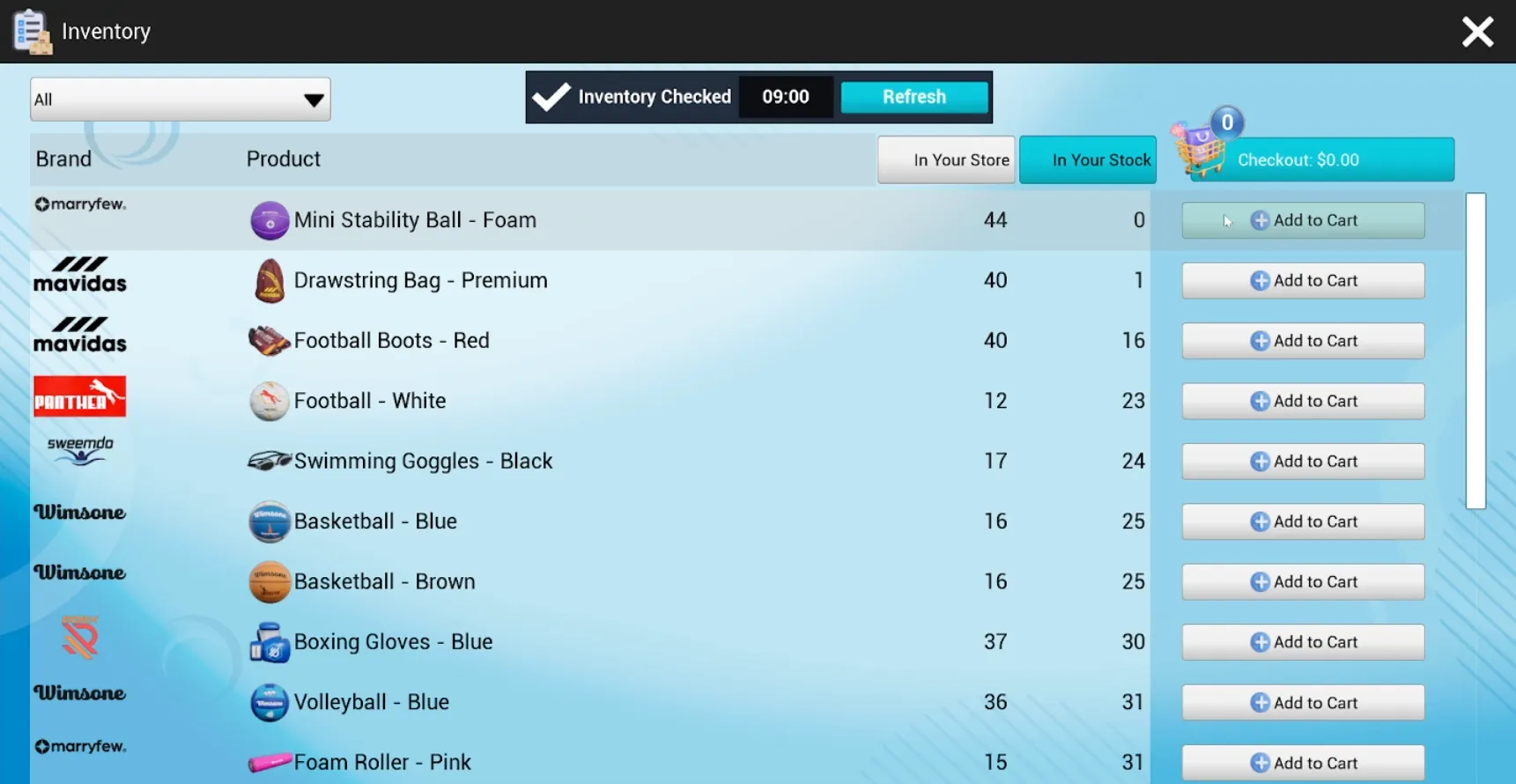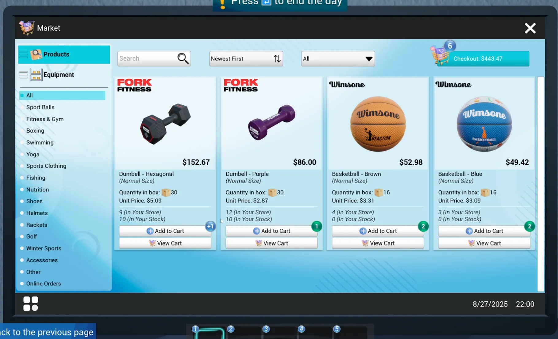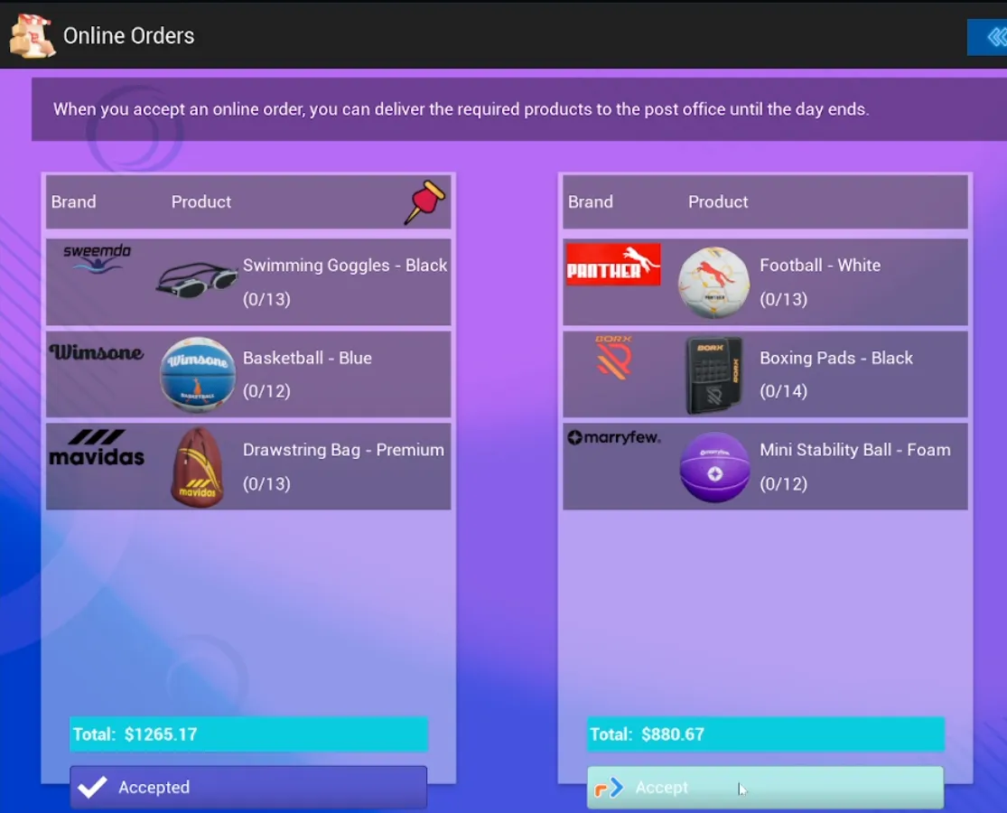 Time in Sporting Goods Shop is interesting. When the shop is closed, time doesn’t move. As long as it hasn’t hit 10 PM at night, you can still order new goods which you can then put onto your shelves and get things ready for the next wave of customers. You can take advantage of this by, and the end of day, move to the next day and immediately make all your purchases and get your store ready for the incoming onslaught.