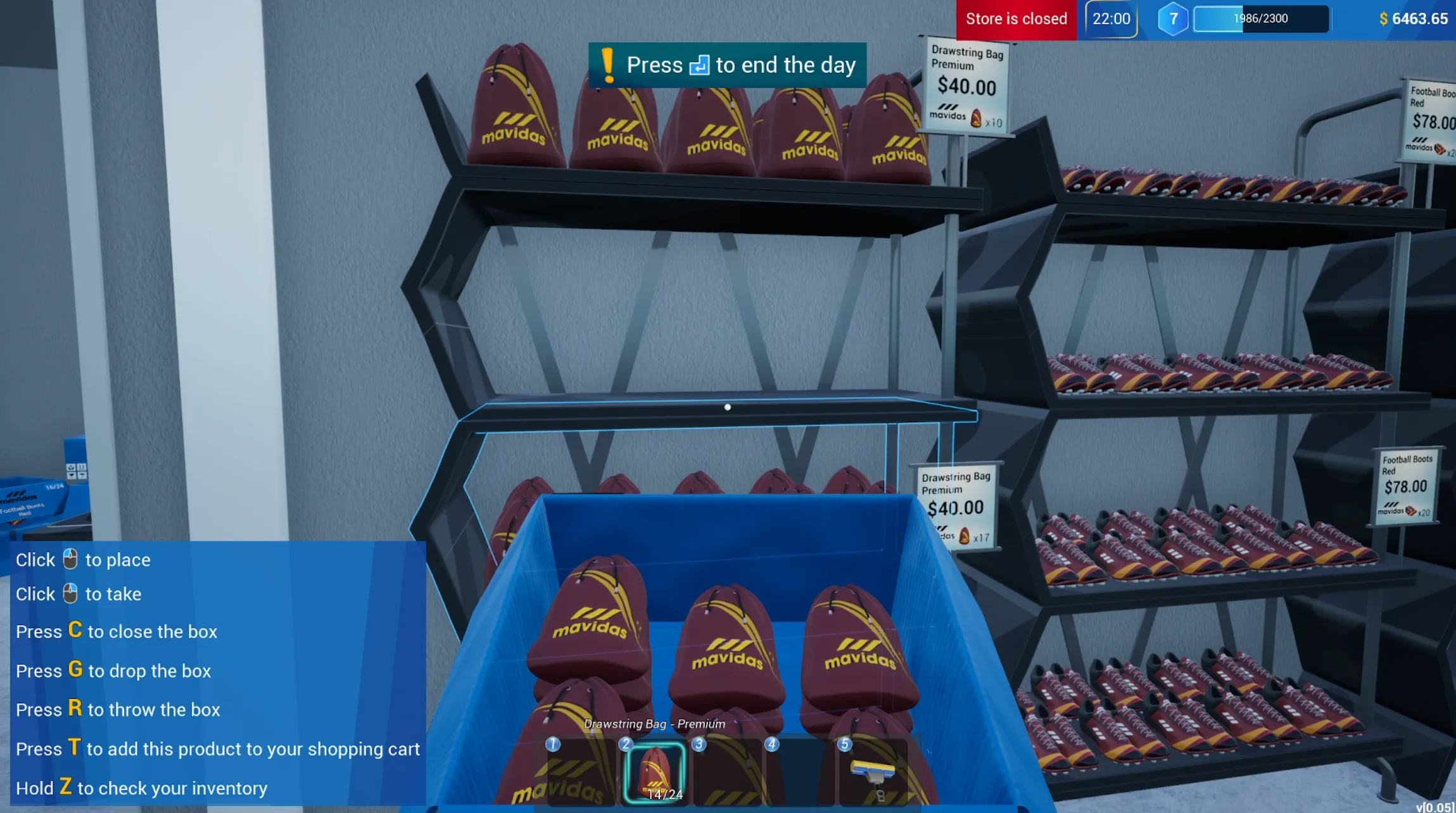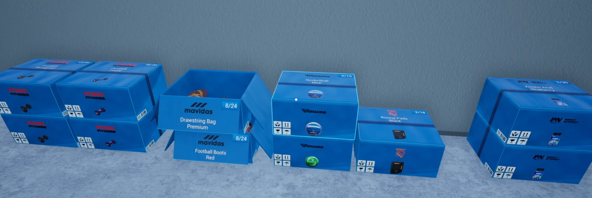 With how physical everything is in Sporting Goods Shop, you need to manage your inventory well. Your initial stock room quickly can become overwhelmed and so it will take time to sort things out if you aren’t staying on top of it. Your ordered stock arrives instantly in a loading bay-type area at the rear of your store, and then you can choose how you want to organize it in your room.