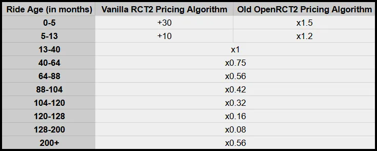 I won't explain precisely how the pricing algorithm works in this article, but the long and short of it is that all of the rating's ratings, and the ride's specific value multiplier assigned to each of those ratings. This calculation algorithm is always exactly the same for every ride, whether it's a measly Merry-Go-Round or a giant steel Giga Coaster. This resulted in a quirk where the prices of giant roller coasters would follow a logical smooth scaling as the ride aged and would have very little effect by the different algorithms, but it resulted in flat rides like the Merry-Go-Round receiving a huge spike in potential pricing for the first 13 months before dropping down dramatically.