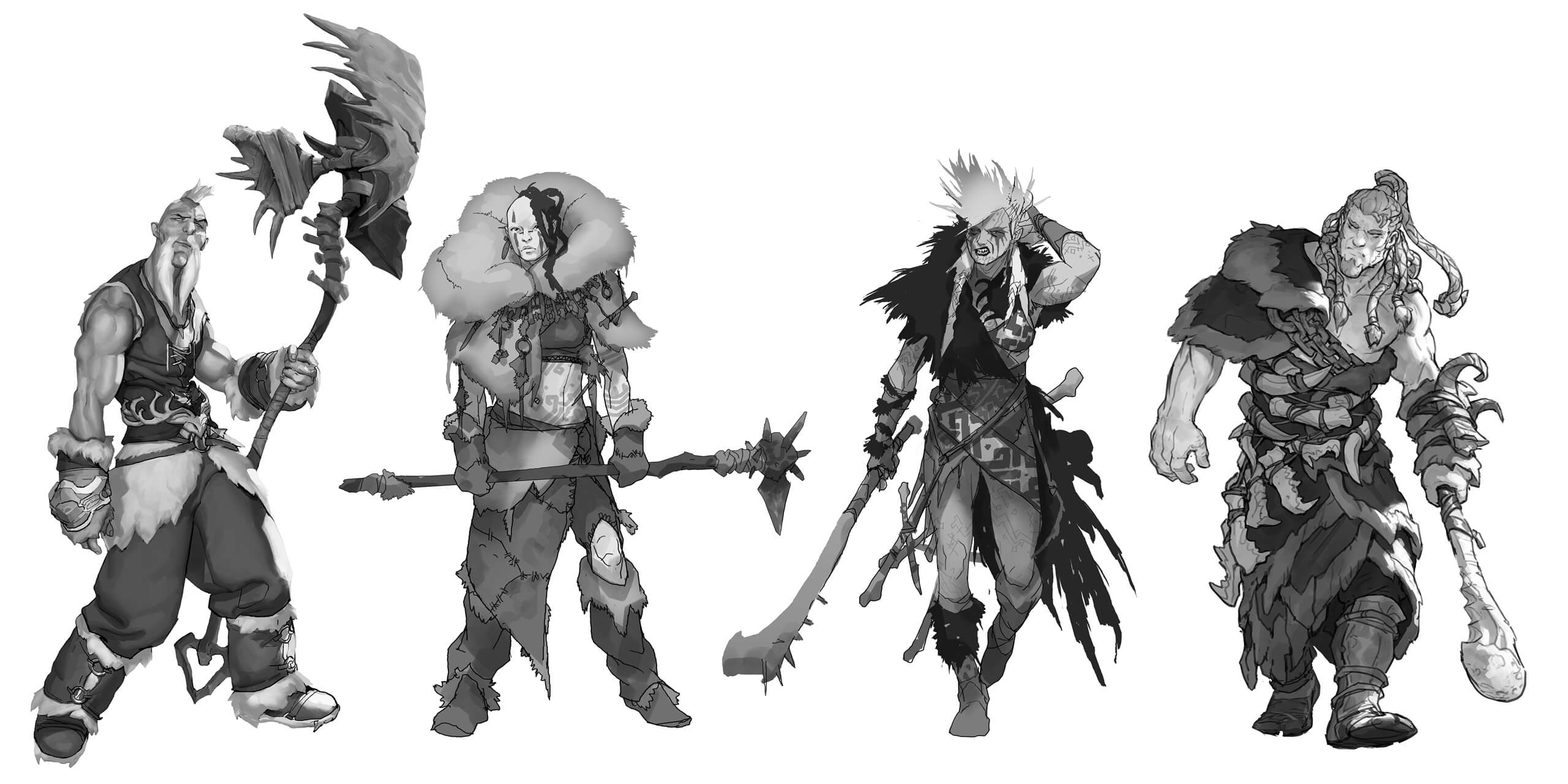 Concept art for Tarkaz the Tribeless (labeled at "Tarkaz 02" internally), whom I feel is tribeless he doesn't have any sense of co-operation, just swinging his weapon at everyone, so no one wants to join him.