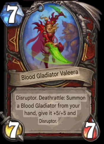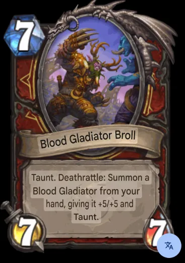 - 7 mana 7/7 legendary: Taunt. Deathrattle: Summon a Blood Gladiator from your hand. Give it +5/+5 and Taunt.