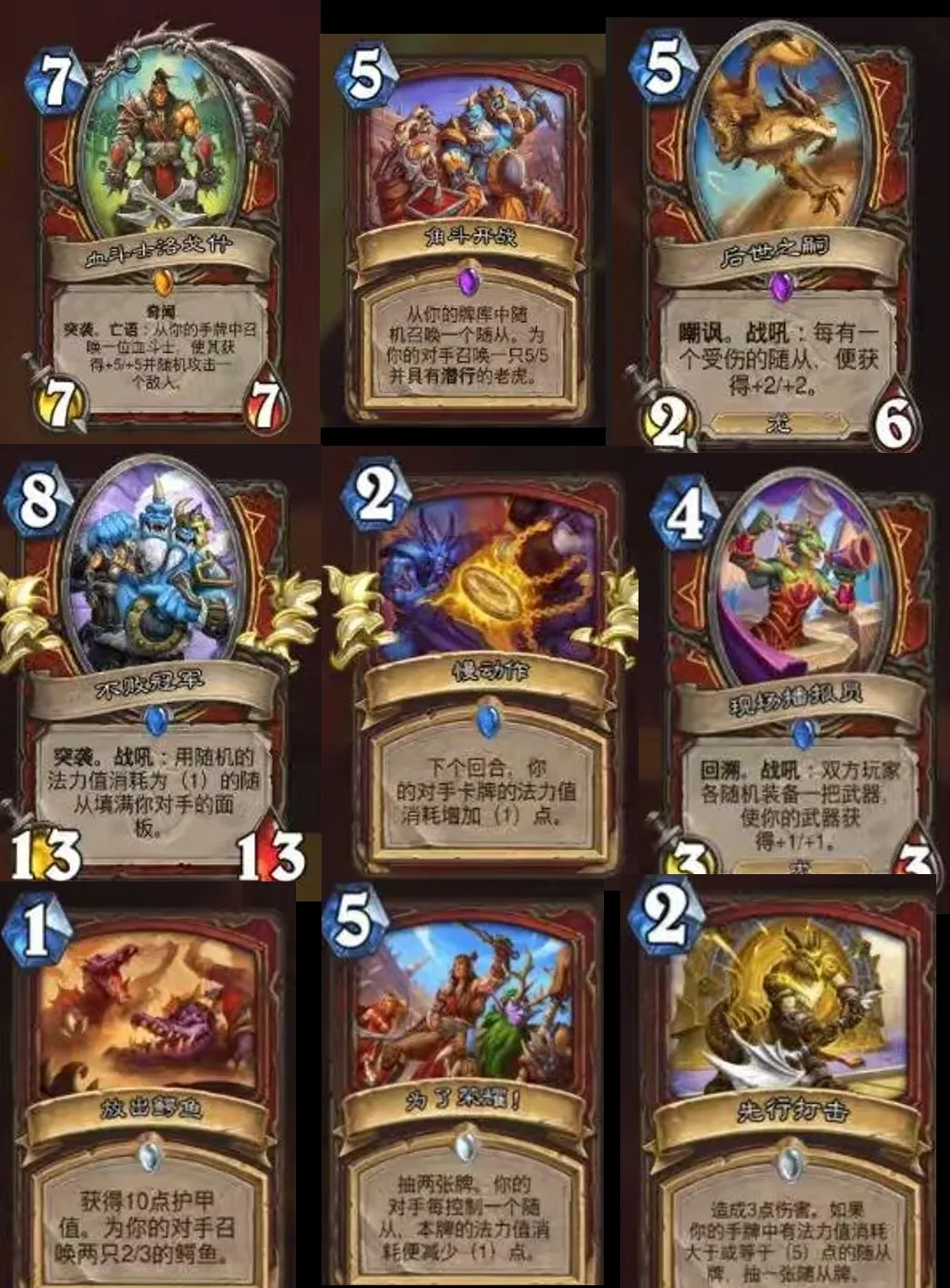 - 7 mana 7/7 legendary: Elusive. Deathrattle: Summon a Blood Gladiator from your hand. Give it +5/+5 and Elusive.