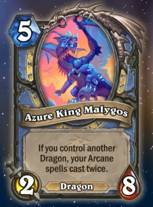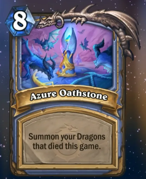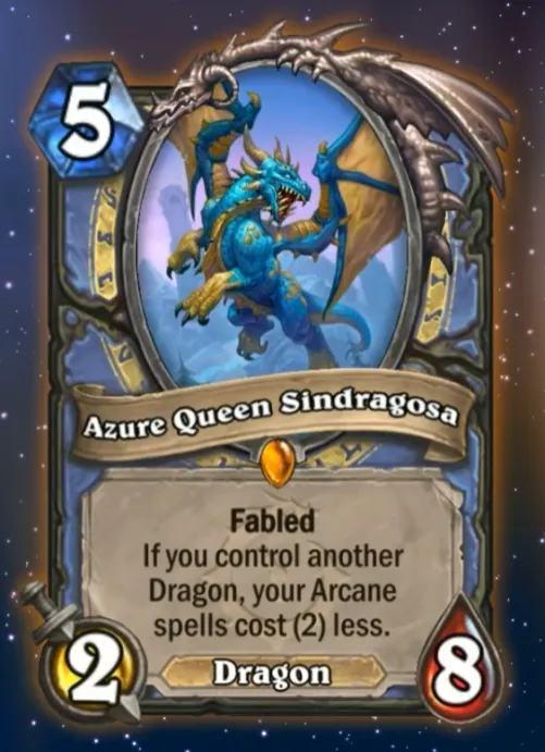 Azure Queen Sindragosa - Its a combo card piece. In fact her entire repertoire of fabled cards are basically just combo because theres zero chance this card sees play in an otherwise normal functioning deck. Both sindragosa and malygos in reality expected to be played or curve and expected to die, with the oathstone bringing them back so you kill the opponent with either cheap arcane spells that youve discovered or gotten via violet spellwing because the only other burn card is the new arcane barrage