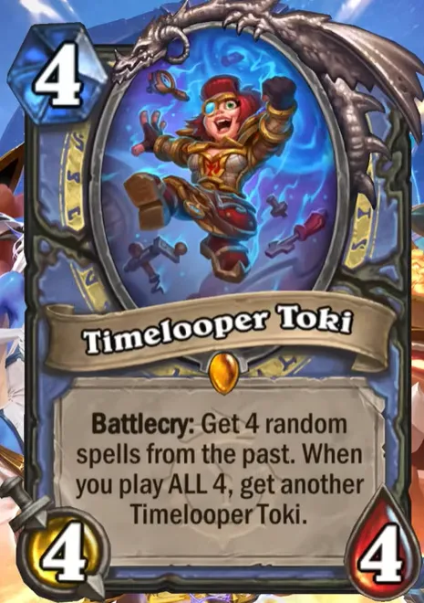 Timelooper Toki - Card that wouldve been playable prior to 2018, but sadly Toki chose the wrong timeline to appear in because mage is neither lacking draw, win cons, card gen, or effective finishers, so toki remains a decent though unimpressive card for a class that dont need her. Absolutely broken in arena though, so toki may want to rejig her time piece next time.