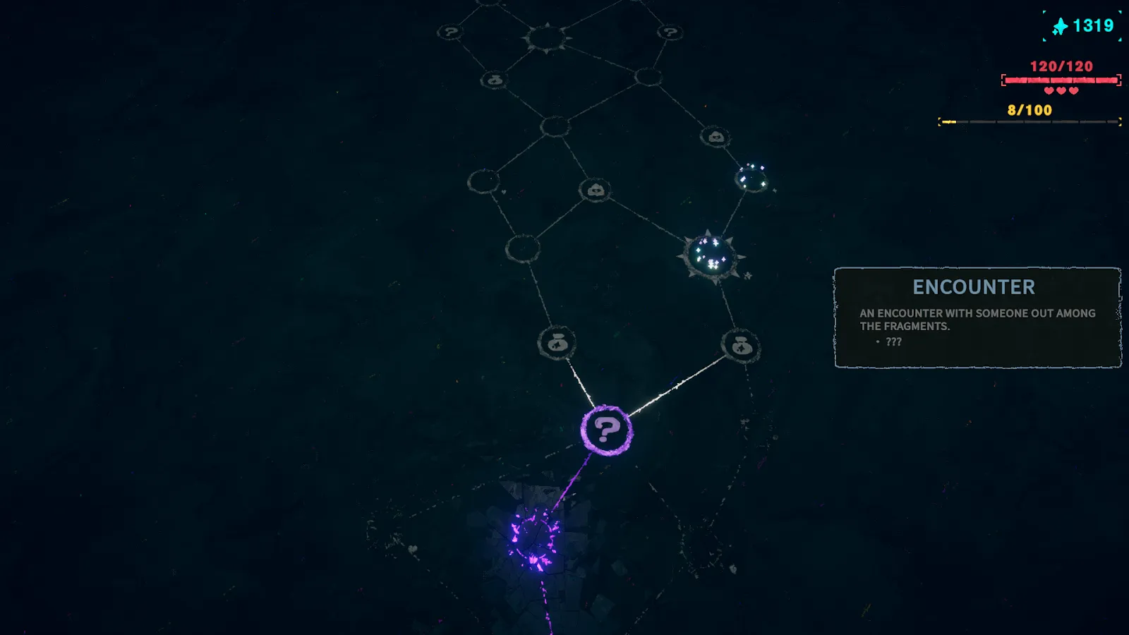Haste’s auto-runner gameplay style makes for a unique roguelike structure. There are ten different “shards” in the game, which is what the game refers to as the levels. Each shard consists of a randomly generated bottom-up map with several different “fragment” types. Blank ones are standard levels, campfires are resting spots where you can get health back, moneybags are shops where you can use the sparks you acquire to buy items. Question marks will take you to random events, which could just simply give you an item, or take you to a special challenge stage. Blank ones with spikes around them indicate “extra difficult” levels which are harder but give you a free item at the end. Lastly, each shard ends with a boss marked by a giant skull. In later shards, you’ll also find particle effects around the level fragments indicating some characteristic that alters the stages.