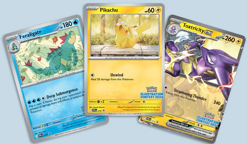 Last year, Pokemon ran a special illustration contest and the top three have had their illustrations turned into real Pokemon cards! These new black-star promo cards feature Pikachu, Feraligatr, and Toxtricity ex and have a special "Pokemon Illustration Contest 2024" logo at the bottom right of them, making them quite unique.