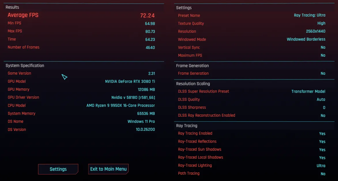 Everyone loves to see performance in Cyberpunk. An average FPS of 72.24 with lows of 64.98, that is more than playable at 1440p on High textures with Ultra ray tracing. Frame Generation was off, so if you want to put fake frames in, you can boost this up too but I don't see a need to enable it.