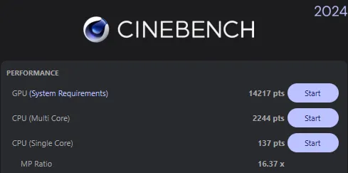 Using Cinebench's latest and greatest, 2024, I ran the testing suite against the 10 minute minimum test duration to account for sustained workloads instead of a one-off. Sustained workload benchmarks are more accurate to lengthy tasks because running your CPU or GPU at max for longer periods of time will cause it to thermal throttle, unless your cooling solution is absolutely perfect at handling load - which this test is representative of. In the sustained test, you can see my GPU score and CPU score both suffer, though more so on the GPU side. Keep in mind though this GPU has never been repadded or repasted in its 4 years of operation, so it may not be performing the most optimally.