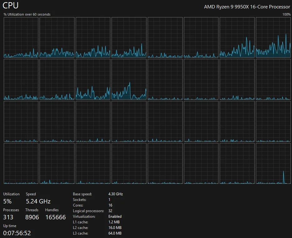 Now, one could argue that I should have gone with an X3D variant processor that was toned down on the core count to chase CPU performance but that's not why I went with this processor. I went with the 9950X because I need tons of cores for multitasking. A lot of the software I have written to aid me in tasks incorporates multithreading so if I have more threads, it means I can let them run in parallel, speeding up my tasks. This will also help out though when I have a million applications open, which I always have a million applications open.