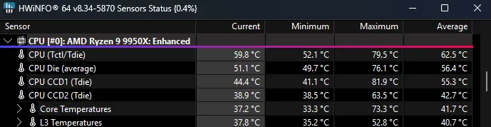 After a 30 minute gaming session, with the Ultra Preset with No PostFX and No FSR, the 9950X saw a max temp of 79c on the CPU die. After closing the game and waiting for 6 minutes, we were down to 50c at idle, the same temperature the CPU is at shortly after booting Windows and allowing things to settle.