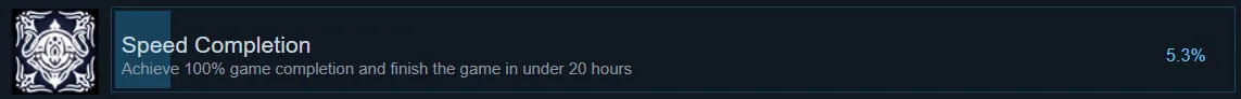 Then there’s how long you’re expected to grind and stay focused in the speedrunning mindset. Completing a certain platforming stage in under 5 or 6 minutes? Fine. Drive one lap of the Nurburgring Nordschleife in under 7 minutes or so with a particular car? Sure, I can do that. Beat the entire fucking game within a certain number of hours? Hell no! Did you miss the multi-hour cap for getting the achievement by merely a few seconds? Sucks for you. Have to do a whole ‘nother playthrough for a chance at that stupid speedrunning achievement. Hope you enjoy trying to 100% Hollow Knight in under 20 hours because that’s an achievement. Amazingly, a whole 5% of people who have opened the game on Steam have that achievement.