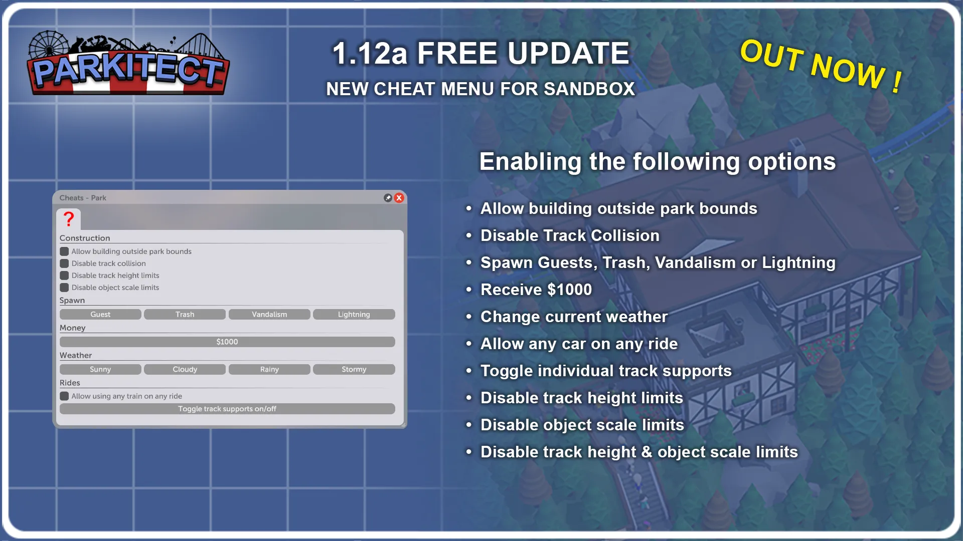 Some of the cheats are self-explanatory, such as changing the weather or granting $1000. But for players who aren’t Parkitect veterans, we wanted to explain what the others do and how you might use them.