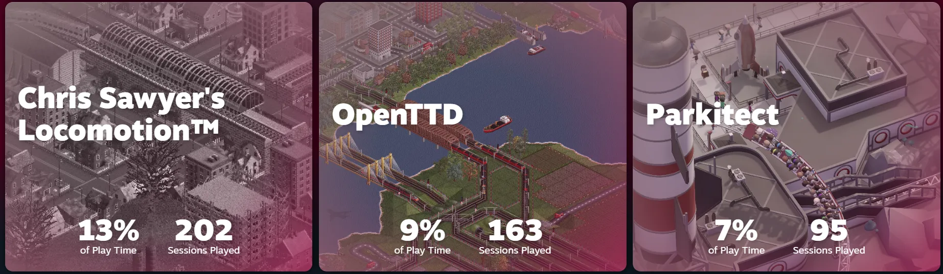Surprisingly, Chris Sawyer's Locomotion ended up being my most played game this year in terms of play time percentage. It's a really good game, and as I mentioned in my review, it's extremely underrated. You can often buy it on Steam for less than $2 (hint, hint), and given that it's a spiritual sequel to the game OpenTTD is based on, and that is itself the precursor to the game that Parkitect is inspired by... I think you can say that this is one of my types.