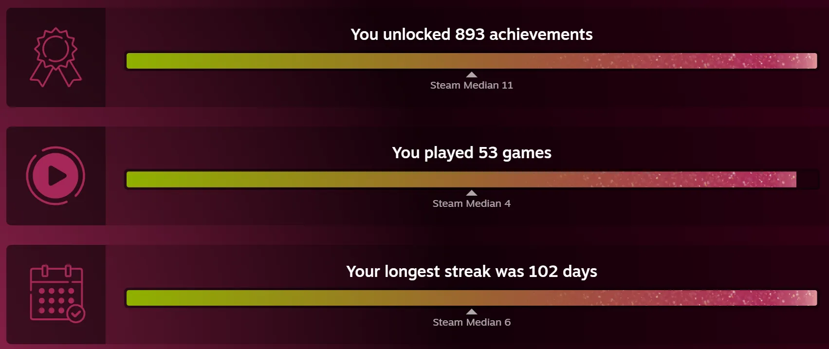 This year's Steam Replay is also out. Every piece of game time you've spent between January 1st and December 14th has been tracked, so you can see all of the data in terms of what games you've played this year, what amount of your game time was spent playing a specific game, and how many achievements you've unlocked. Here's a taste of mine.
