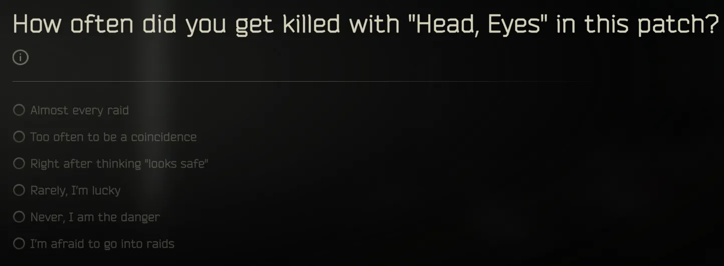 Next up is a moment of asking how players are feeling about getting headshot, is it happening too much? This could be a way to gauge how people are feeling about potential cheaters and the level of player confidence based on their other answers. Cheating feels like the main question here though because Tarkov has been infamous for cheaters playing the game and 1.0 introduced new anti-cheat measures.