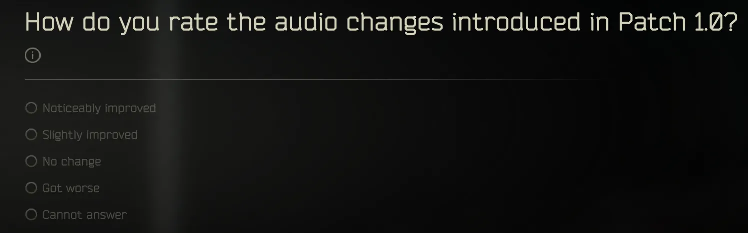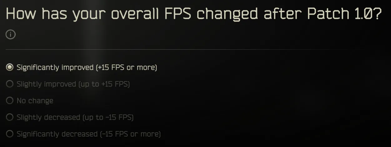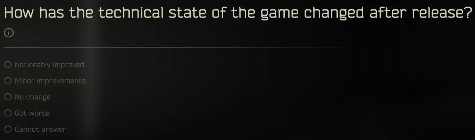 After getting stories out of the way, we see questions about how your game performance has seen gains (or lack of) after the 1.0 Patch. This includes a question focused on their audio changes, the graphical FPS improvements, and a general how you feel about the technical state of the game.