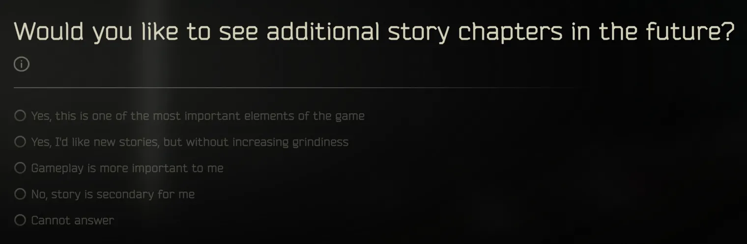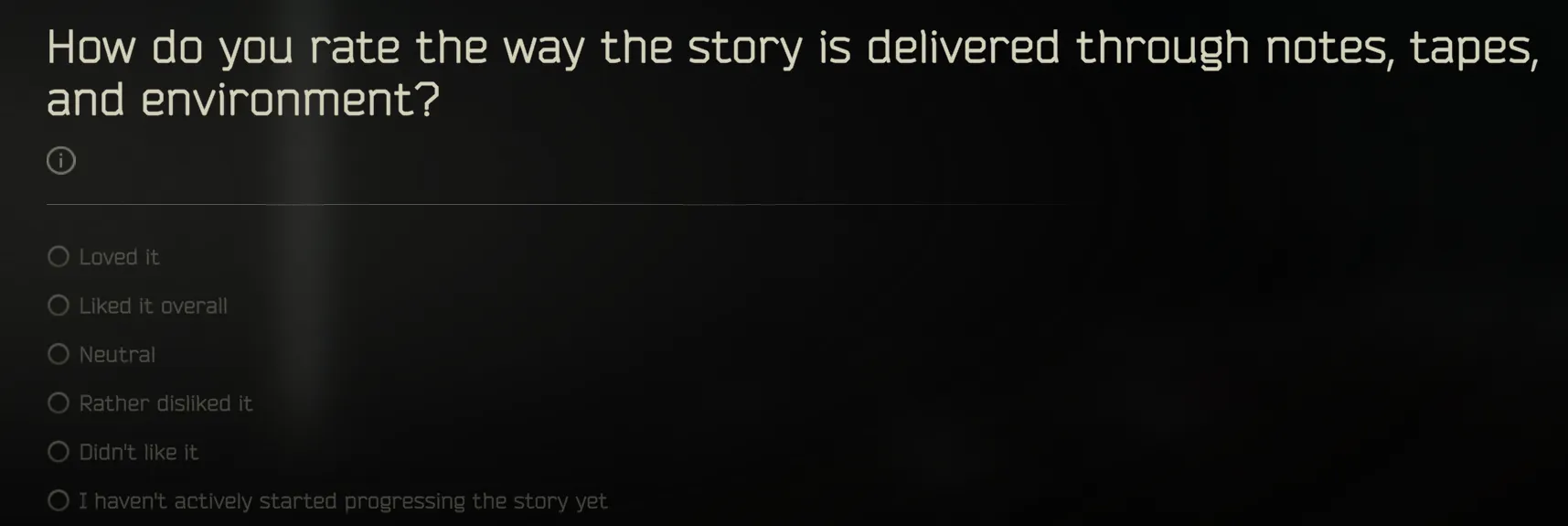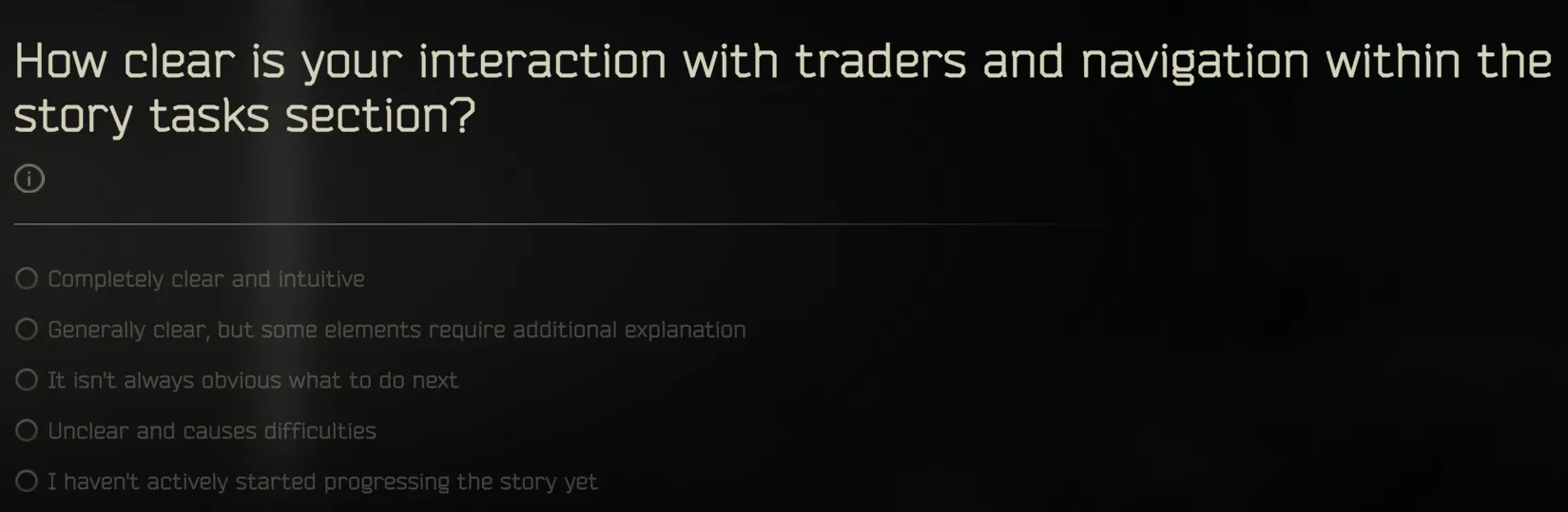 The survey starts off by asking about your current story progression. This then leads into whether or not you find your trader interactions for the story clear, and if you want to see more story added to the game in future updates. Do you think Tarkov is doing a good job with story-telling?