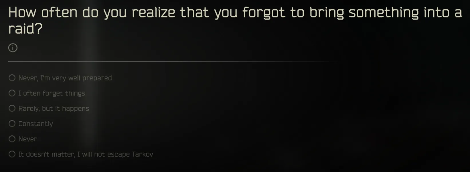 But are PVE players more confident in their abilities than PVP? That's also a solid question that you can make some judgements on with this kind of question. Player forgetfulness, which is almost certainly a UI hurdle when it comes to Tarkov, is also brought up.