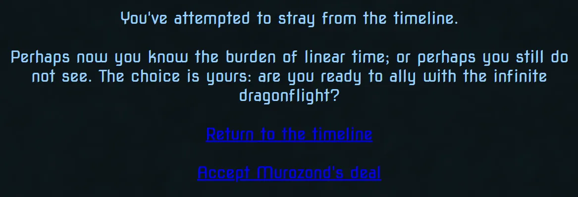 If it any point, you do try to go back and stray from the timeline, you will have the option to return to the timeline which simply takes you back to where you were, or another option to "Accept Murozond's deal."