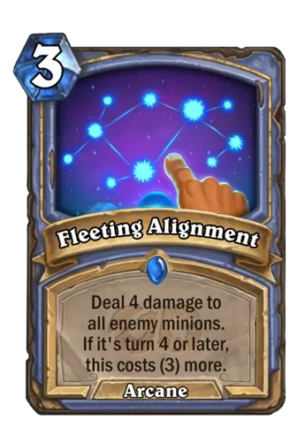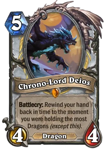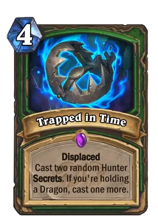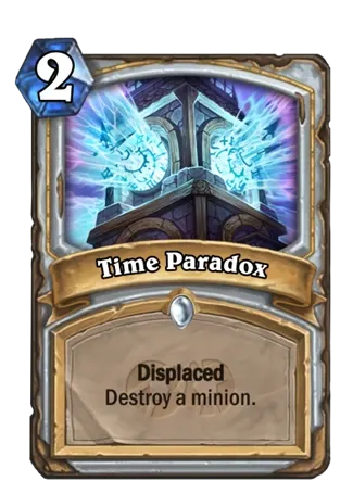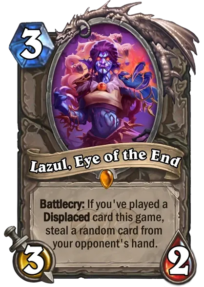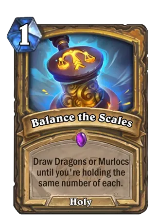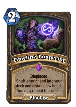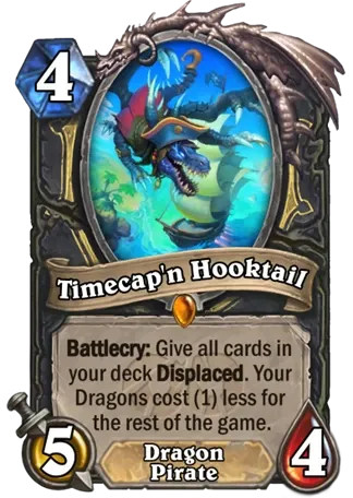 Displaced was also fun to explore the design space of. It has a lot going on, which I’m usually not a fan of for custom mechanics, but it ultimately gets used in so many different ways that I feel the number of moving parts is justified. Hunter uses it to play Dragons in a no-minion deck, Paladins use it for Balance the Scales, Rogue uses it for shuffle synergies, Warlock prolongs their deck while gaining discard fodder, and Priest just wants to hold Dragons".