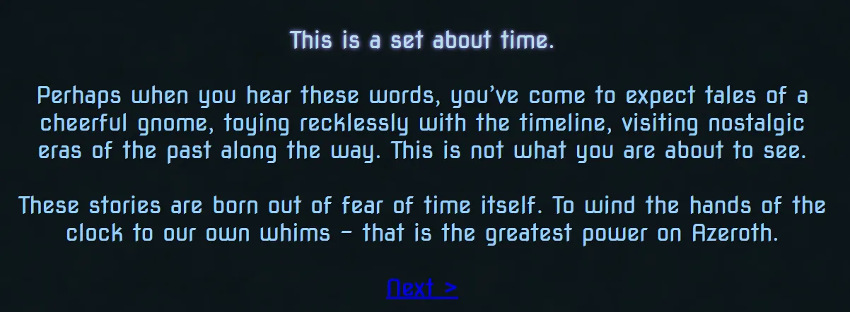 When the set was initially posted, only the Death Knight cards were visible with the other classes being unavailable until a timer fully ran out, giving the custom set a reveal season of its own like a real expansion would. The option to accept Murozond's deal would allow you to skip this and view all of the cards instantly, though this option no longer does anything since all of the cards have been revealed as normal now.