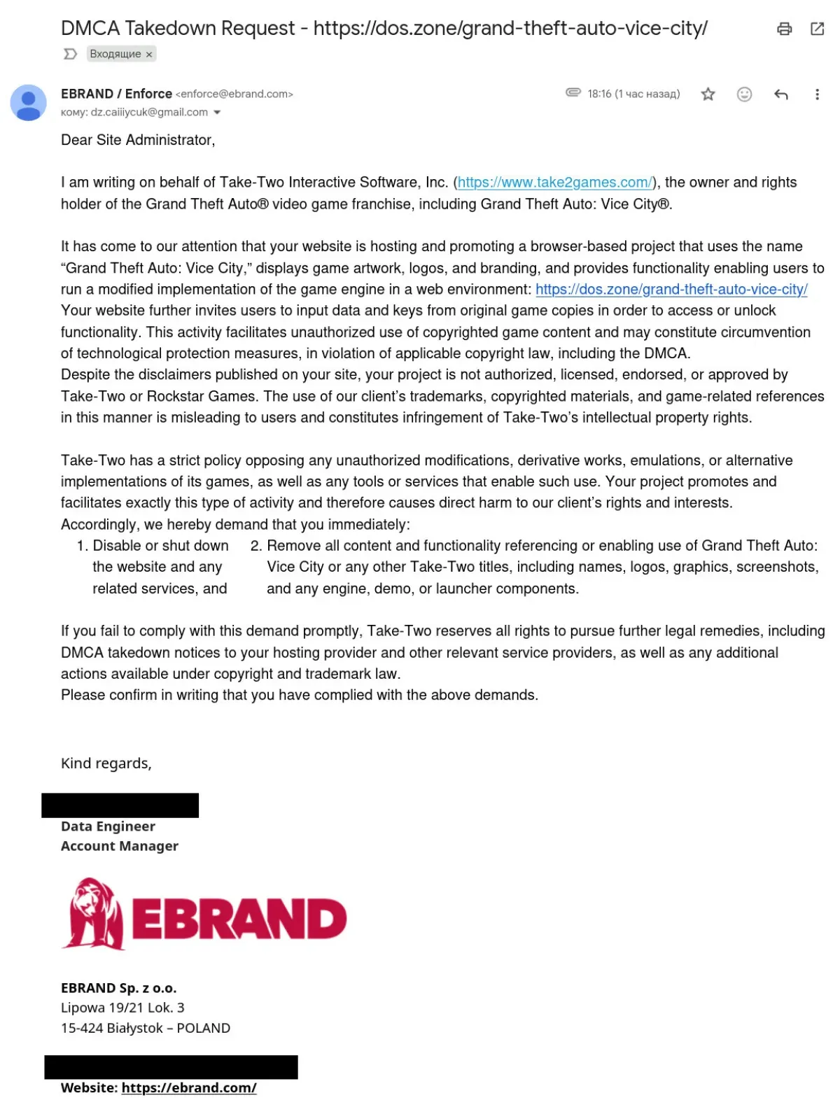 We had expected that it wouldn't last very long, and that seems to be exactly what has happened as DOS Zone has taken down the game. If you go to the game's page on DOS Zone, you won't find the game but instead an e-mail from EBRAND, writing on behalf of Take-Two interactive, requesting that the managers of DOS Zone to take the game down.