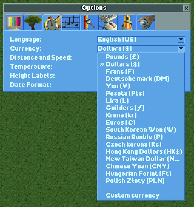 All of the currency options from Pounds down to Euros are vanilla RCT2 content. Everything below that was added to OpenRCT2 in some update.