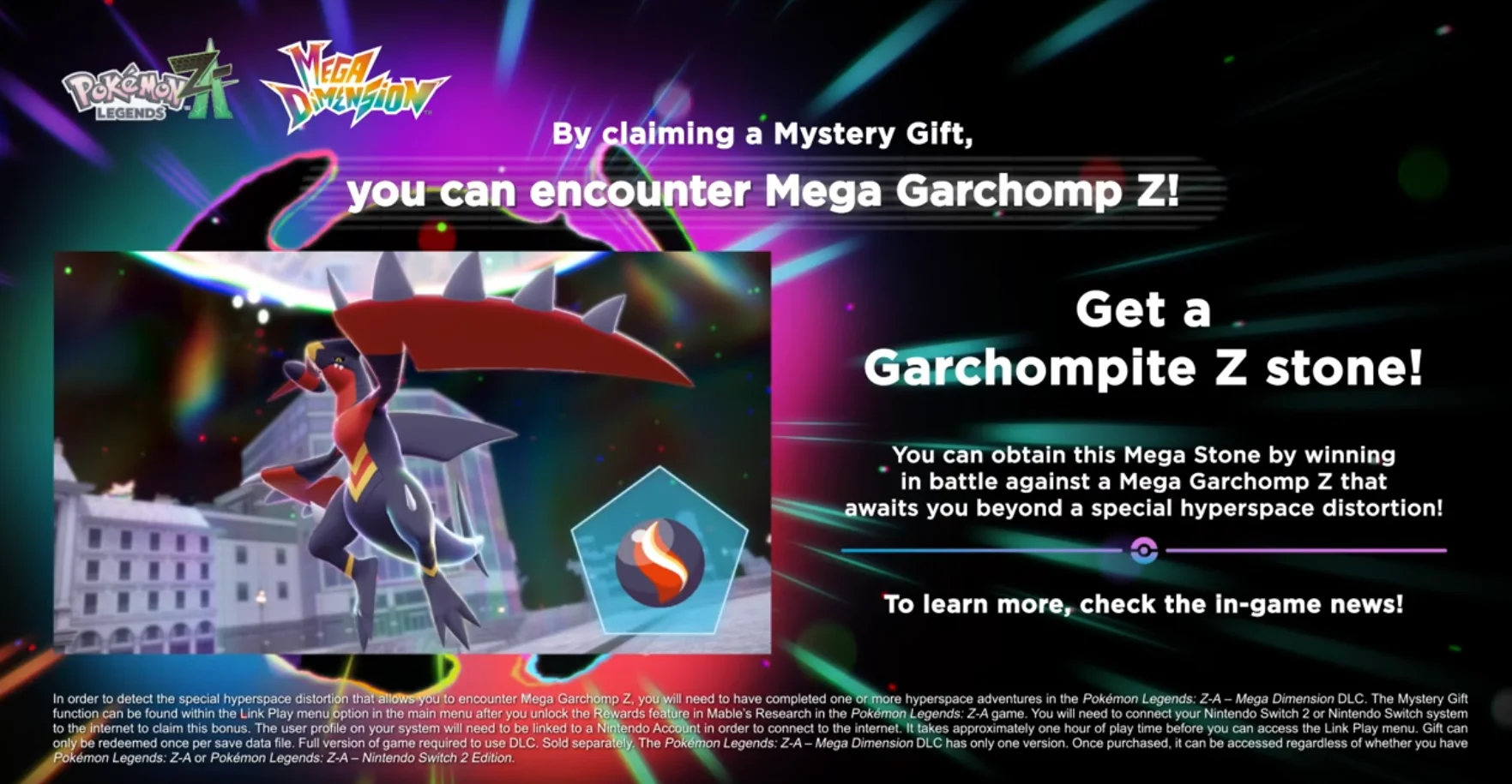 Go go go! Claim yourself a Mystery Gift in Pokemon Legends Z-A now and you can unlock the ability to obtain a Garchompite Z stone to evolve your Garchomp into Mega Garchomp Z by defeating Mega Garchomp Z in a battle.