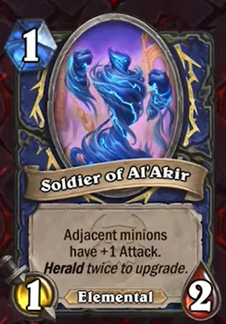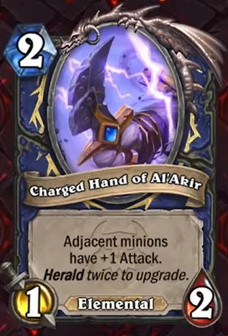 Al'Akir, Conduit of Storms - It has rush and windfury, and the odds are it'll have at least 6 attack most of the time so the card is solid. Kill two things, and get a bonus two big minions that cost 1. Well, thats it really. Its not exactly a very interesting card but it'll see play.