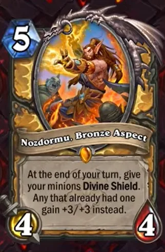 Nozdormu, Bronze Aspect - On the face of it, its really not that impressive since theres a near zero chance of this triggering the +3 stats and the divine shield comes at the end of the turn. But with the support cards printed for paladin, this drastically scales in power, ensuring that if played correctly, youre gonna end your turn with a giant board of divine shielded minions.