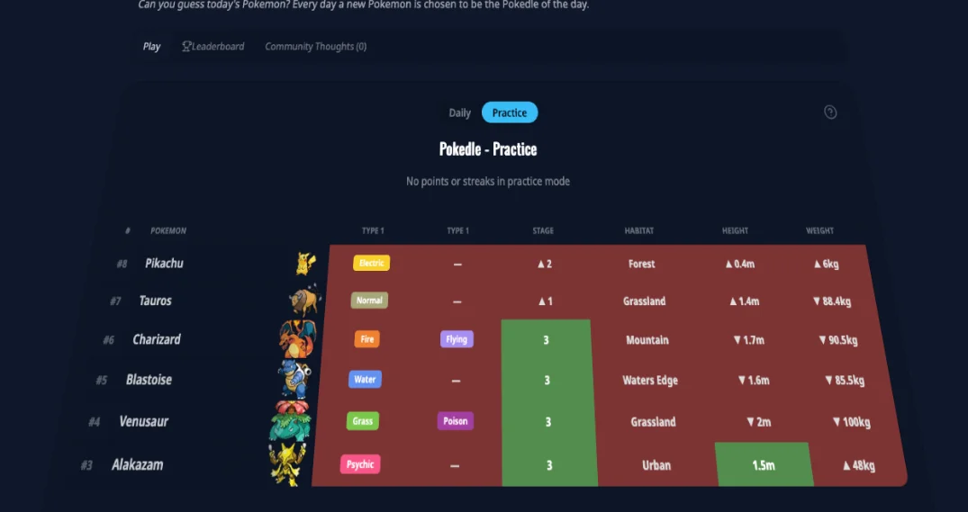 We've got a brand new feature called Pokedle! This is a Wordle clone that takes the Pokemon in our database (not all the wild Galarian and such types) and creates daily puzzles to solve. Daily puzzles are going to be enabled this Sunday, so in anticipation of that momentous occasion, we have a Practice Mode for you to try.