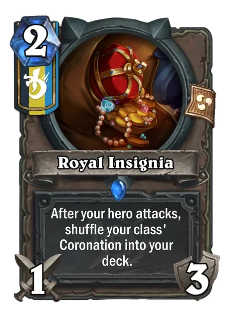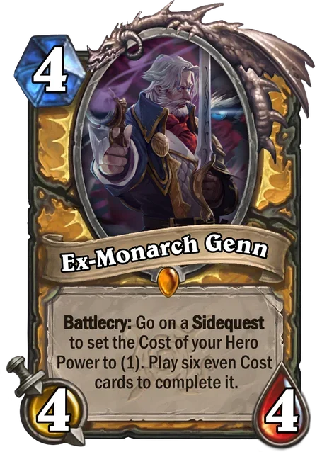 Palestar: "I needed a way to force myself to finish the set. So I wanted to make custom art assets, so I’d feel guilty if I didn’t finish the set, one of which were Banners. I was intrigued with the idea of depicting the Noble families vying for power like the gangs in Gadgetzan and I really did not want to make a banner based keyword. I remember at first I had planed a 3/3/3/2 Faction split, tho I cut the “Creed” dual-class faction of shaman and druid as I didn’t enjoy it’s theme and play style (Minions transforming into dragons on board, kinda like the new hunter set in Cataclysm but on board). The other 3 factions quite naturally found their archetypes: Undead and Deathrattles for the Invasion, Aggro for the Crowleys and… SECRETS For the Greymanes?! Yes Secrets originally. Originally I planed on designing legendary secrets for all 3 Greymane Classes, but while designing I noticed a key issue: I was not having fun designing secrets. So I just tried around a bit, until I landed on the Coronation/Echo-Callback archetype of the final set. Some cards from the first draft of the Greymane faction are still part of the neutral set."