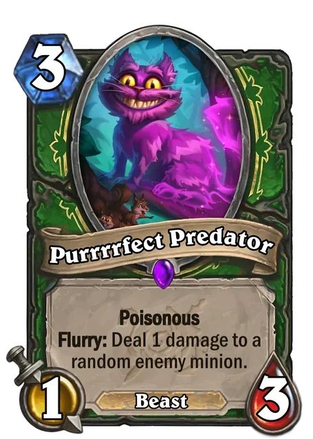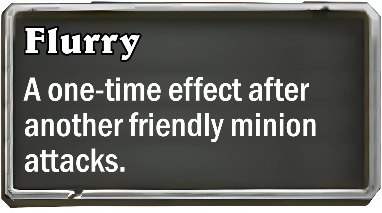 Palestar: "I was aiming for a simple new keyword that would be easy to understand and design for. I also wanted to push board based game play, as when I started working on the set cards like Reno Lone-Ranger were still in standard, causing a pretty big sentiment that “board based game play was dead” among many players. Flurry is a mechanic that is supposed to synergize with Rush, a mechanic the Witchwood is famous for. I landed on “Spellburst but for Attacks”. Originally their was a positioning angle to Flurry where it only counted attacks of minions to the right or left of the Flurry minion, but I quickly noticed that that was very “fake interesting” to say it in CHS terms. Flavorwise the inspiration was fencing originally tho that is only in name now."