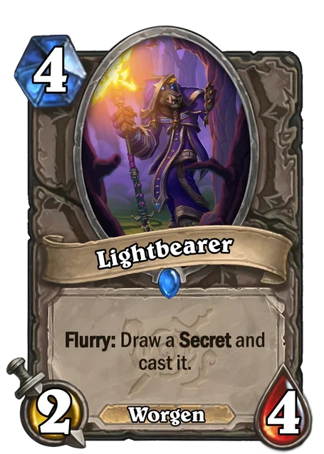 Wait. What does Lightbearer say on the bottom? In our grand return to the land of worgen, they've been added as a new minion type in this set. Just like the feral beasts that they resemble, Worgen minions tend too be ruthless and aggressive. When one hits the field, blood will be spilled. I do object on the fact that the card claims to be a "bearer" and Worgens are not bears, but I'll let that one slide.