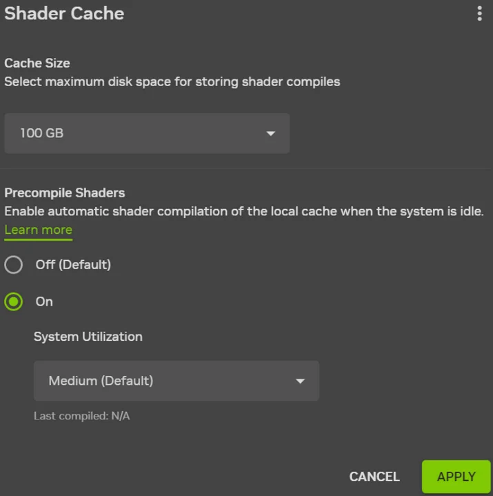 As you can see, you can also change the overall cache size for storing shaders on disk and configure when it is allowed to recompile shaders.