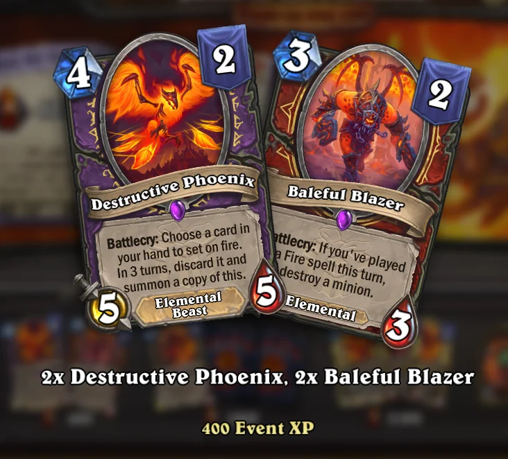 At 400XP, you get two copies of the new Destructive Phoenix and Baleful Blazer cards.
