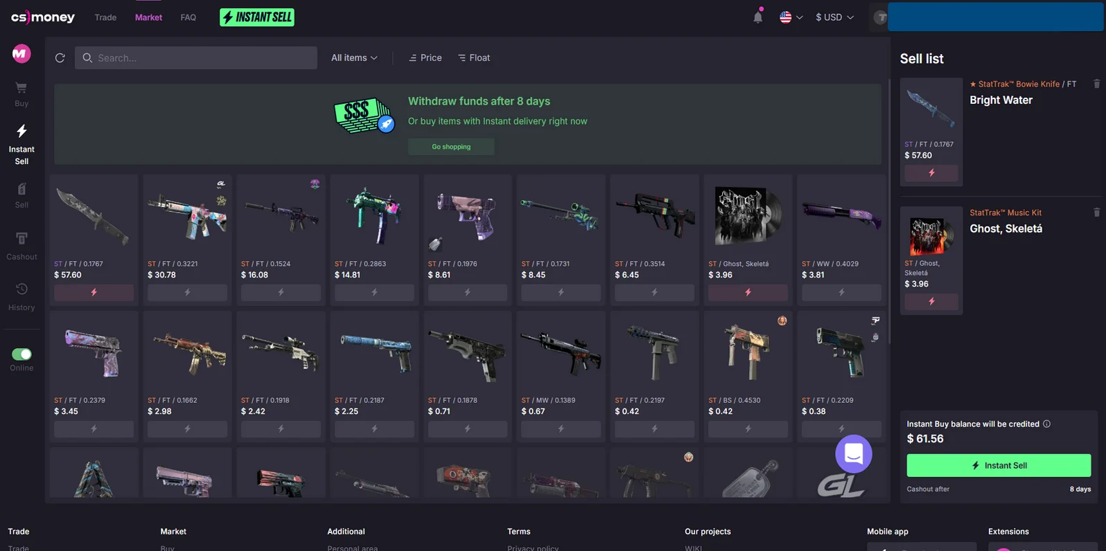 One of the biggest and most trusted CS2 skin marketplaces is CS.MONEY. They have been working for almost a decade and provide a huge variety of different skins and payment options. If you’re not patient enough until a buyer appears, you can use the Instant Sell option to get your money as soon as the Steam trade protection period ends.
