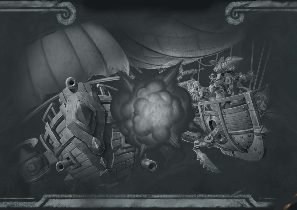 The second chalkboard that was added to the game showcases a battle between two gunships. It doesn't look like it is a Horde vs Alliance battle like one would assume when gunships are hanging out since the gunship on the right sports a League of Explorers emblem. Perhaps this is a brawl that will be concluding the Year of the Dragon. Regardless of what the brawl is, it almost looks like SN1P-SN4P was merged into the ship on the right.
